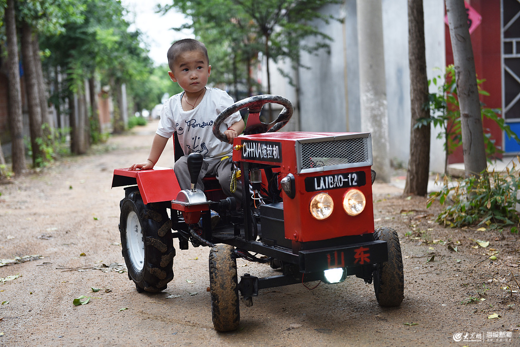 2019年7月7日,在山東省日照經(jīng)濟(jì)技術(shù)開發(fā)區(qū)奎山街道西河村,村民宋成軍造了一輛“迷你拖拉機(jī)”一時(shí)成為村里的新鮮事,每當(dāng)他的兒子開著這輛“迷你拖拉機(jī)”上街玩耍時(shí),都會(huì)吸引人們的圍觀。宋成軍說:“回頭率百分之百。”