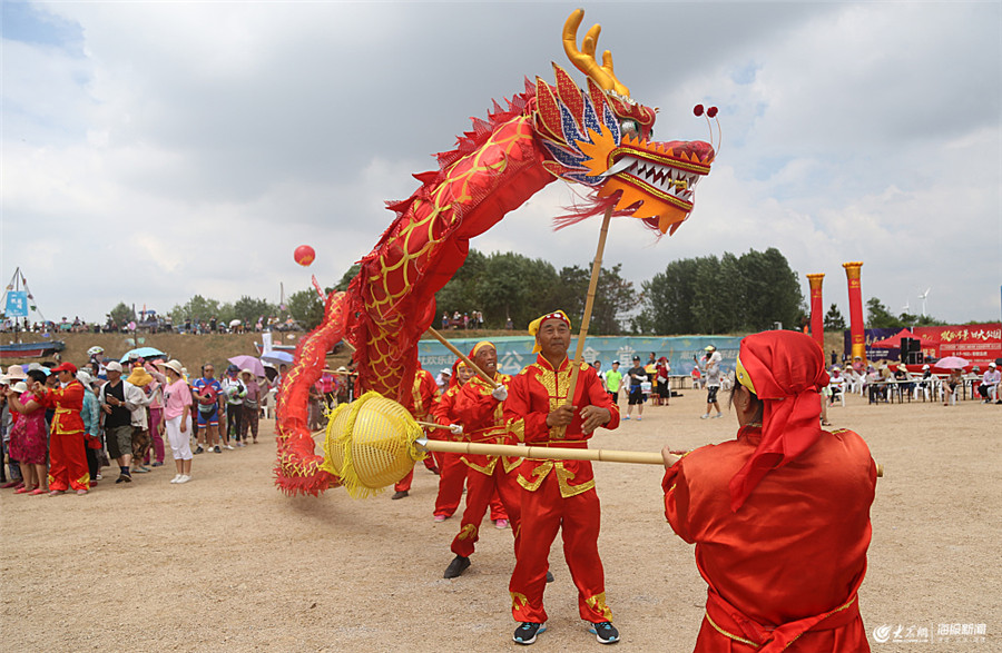 2019年7月20日,山東威海文登區潮汐公社舉行盛大的祭海儀式。舞龍表演。
