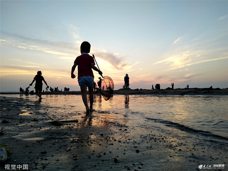 2019年7月23日,山東威海,當(dāng)日是大暑時節(jié),游客紛紛到那香海海邊避暑游玩,夕陽西下剪影美如畫。