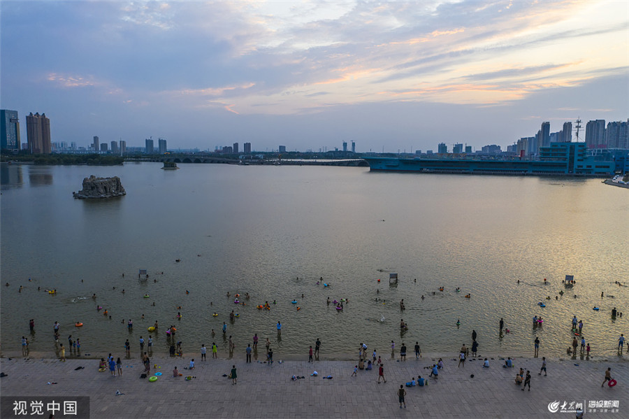 2019年7月24日,山東濱州,大暑節氣后,濱州氣溫再次回升,悶熱的天氣讓眾多市民走進濱州市各開放浴場,或游泳,或踩水,一求清涼。