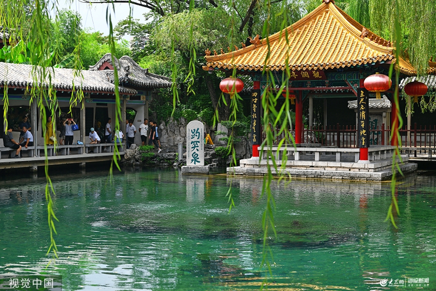 8月5日,游客們在濟(jì)南市趵突泉景區(qū)觀賞泉水。據(jù)了解,受近日幾場降水的影響,趵突泉水位每日都在上漲,當(dāng)日水位達(dá)到了27.91米,與上月同期相比上漲了34厘米,距離回升至28.15米黃色警戒線已經(jīng)不遠(yuǎn)。