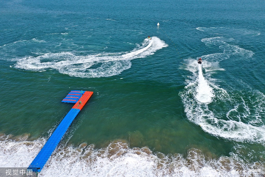 2019年8月4日,山東榮成,在濱海公園的海水浴場,人們戲水納涼、消暑度假。盛夏大暑時節,海水浴場,海風習習,白浪逐沙灘,吸引了眾多游客前來戲水納涼、消暑度假。