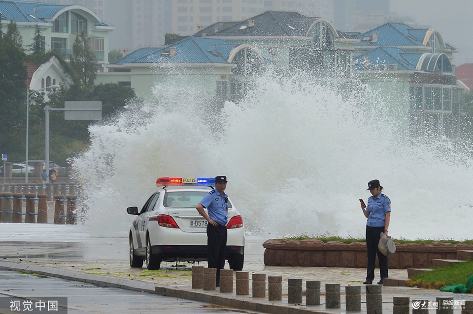 2019年8月12日,山東省青島市公安部門在大浪掀起的海岸線日夜守護,防止次生災害發生。圖片作者:王海濱/視覺中國