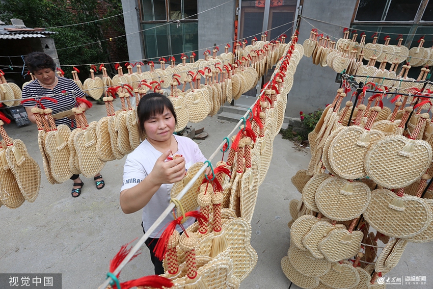 2019年8月6日,山東泰安新泰市羊流鎮的三洼村,麥稈扇制作工藝第四代傳人張蓉蓉就利用手中的麥稈,既傳承了老一輩的傳統手工制扇技藝,又讓小小的麥稈扇搖出了致富風。走進張蓉蓉家的院子,迎面就有淡淡的麥稈香,二三十位中年婦女正熟練地將制作好的麥稈辮加工成扇子。編把、纏把、浸泡、編網、合片、絞樣、沿邊、上把、修剪……十幾道工序分工明確、有條不紊,流水制作,傳承人張蓉蓉則在一旁做最后的把關工序。這些剛剛制作而成,還散發著麥稈清香的扇子很快就將裝箱發往外省的銷售商。