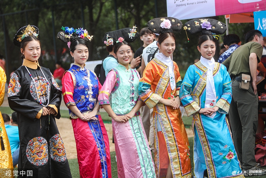 2019年8月27日,濟南,開學季來臨,山東女子學院迎來2019級新生報到。高年級學姐們身著漢服或裝扮成“格格”的模樣,用歌聲、舞蹈、鑼鼓展示出女大學生的青春風采。