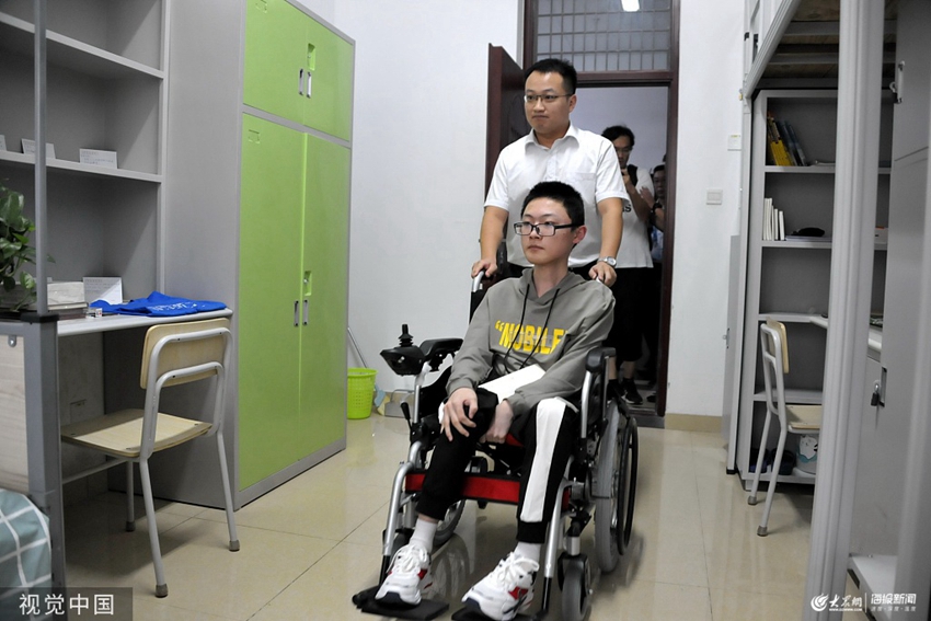 2019年09月01日,濟南,在山東大學中心校區,由父親背著上學的濰坊青州男孩張連川來新生報到了。青州一中的張連川,2012年患上進行性肌肉營養不良癥,從初中到高中,六年時間,父親張玉坤背著他上學放學。今年,張連川以理科637的高分考入山東大學。張連川在父親的陪伴下來校報到。學校決定為張連川減免部分學費,并為他的父親張玉坤準備一個公益崗位,還為他提供住宿便利,讓他既能有一份收入也可以繼續照顧兒子,安心伴讀。未來四年,張云坤表示,將一邊做好工作在一邊照顧孩子,繼續背兒子讀完大學。
