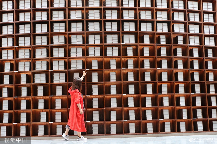 2019年5月26日,在山東省曲阜市孔子博物館內,一位游客參觀館內的典藏書墻。今年是孔子誕辰2570周年,2019中國(曲阜)國際孔子文化節將于9月6日在濟寧曲阜市開幕,屆時,孔子博物館將舉行開館活動。
