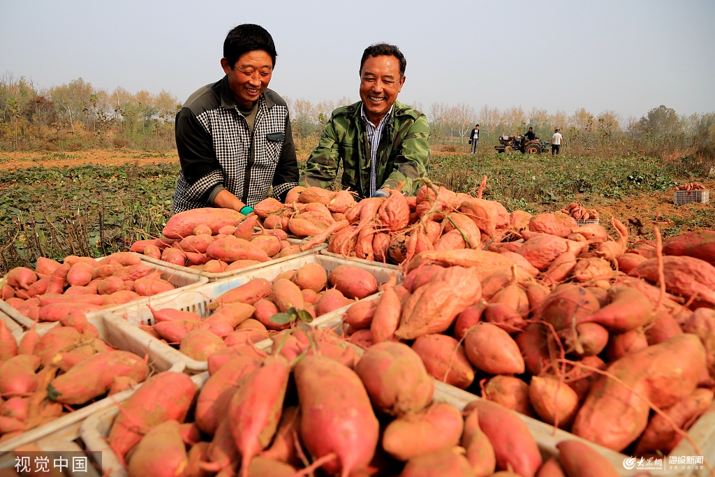 2019年10月23日,在青島西海岸新區六汪鎮青島祝茲侯生態農業觀光園,農民在田間收獲“蜜薯”。