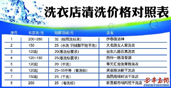 記者問價的八家店分別為大名路女人家洗衣、臺東八路百惠洗衣、西仲一路清青源干洗店、奉天匯旁洗青雅洗衣、芙蓉路潔新干洗店、托馬斯旁邊綠時潔干洗店、新貴都市場邦尼干洗店、潔神伊春路店。其中短款羽絨服的價格最高為潔神干洗店32元,百惠洗衣和洗青雅洗衣的價格最低為20元,其余都為25元。當記者詢問起洗滌方式,只有綠時潔干洗店和洗青雅洗衣的工作人員告訴記者使用干洗,其他店都表示會按照水洗標簽進行清洗,而據記者所知羽絨服并不適合干洗。而長款皮衣的價格最低要價為120元,最高為280元,價格竟然相差了一倍。