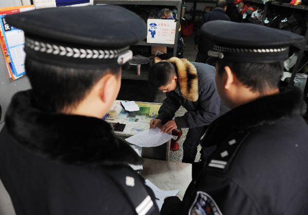 1月17日,商戶主動簽署不倒賣火車票承諾書。當日,重慶市鐵路公安處派出20名民警,與火車站附近的商戶簽訂不倒賣火車票承諾書。據悉,在以往的案件中,火車站附近是火車票“黃牛黨”的聚集地,部分商戶參與了非法倒賣火車票的行為,嚴重侵害了廣大旅客群眾的合法權益。新華社記者 陳誠 攝