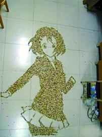從幾幅畫中的地板相同、背景頗像學校宿舍來看,應在同一場所拍攝,作者或許是春節沒有回家的大學生?梢源_定的是,這位網友相當有才,想到將瓜子殼廢物利用起來。以地面為畫布,以瓜子殼做“沙”,經作者的一番妙手后,“輕音少女”、“海綿寶寶”、“皮卡丘”等卡通形象便躍然地上,成就了一幅幅特別的“沙畫”。不過,卡通形象繪畫并非這組繪畫的最出彩之作,令廣大網友大呼“寂寞”的乃是一幅“人影”瓜子畫。只見燈光下,一黑衣男子挺拔站立,在地面投下影子一片;而大量瓜子殼不多不少、邊緣清晰地填入了這片影子,還原出人影的形狀。黑衣人身與棕黃色瓜子殼人影相映襯,寂寞之感油然而生。