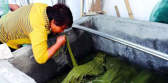 廠房外的空地上搭有上百根竹杠,竹杠上曬滿了粉條。十幾個水池內(nèi)則泡滿了半成品,呈烏綠色,池內(nèi)液體則發(fā)出陣陣惡臭。