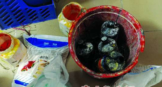 檢查發(fā)現(xiàn),該作坊的紅薯粉是用普通玉米淀粉做原料。現(xiàn)場還發(fā)現(xiàn)大量墨汁、檸檬黃60、果綠等添加劑,黑色液體也正是由這些添加劑兌成。