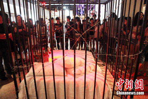 記者在現場看到,鐵籠子的畢業設計名稱是“無處安放的溫柔”,籠內放有一張床,床上的畢業設計說明上寫著:“要表達出每個人都想要得到的溫柔但又觸不可及的一種感覺……布展第三天,行為藝術,表達目前流行的‘裸婚’問題。”獨特的造型加上裸體行為藝術,使得該作品成為整個展廳的亮點。