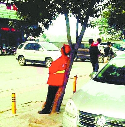 靠樹打盹環衛工引關注 怕扣錢不敢坐下