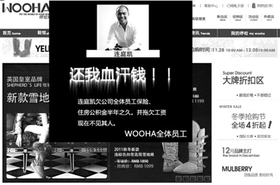 本報訊 (記者 李斌) “還我血汗錢”前天,登錄奢侈品折扣網站呼哈網的用戶大跌眼鏡,他們看到的是一幅用大紅色字體書寫的討薪圖片,該圖片署名為“WOOHA全體員工”。外界認為是呼哈網員工為討薪黑掉了自己的公司網站,逼老板連庭凱露面解決問題。也有網友懷疑討薪圖片是軟廣告,是呼哈網赤裸裸的炒作。