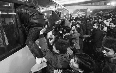 網(wǎng)絡(luò)熱傳的“爬窗圖”照片所指時間是2月13日傍晚5點半。在北京國貿(mào)附近的一處公交車站,一輛815路公交車剛剛停穩(wěn),已經(jīng)在此等候多時的上百名乘客一窩蜂地沖向公交車。窄小的公交車門已經(jīng)不能容納如此洶涌的人流了。公交車的窗戶自然而然地成了乘客們的捷徑,眾多“武林高手”不顧形象,連蹬帶爬,連拖帶拽,爭先恐后地擠上公交車。一些體力強的乘客還能靠自己的力量,以“爬”的方式從窗戶進去。而一些體力弱的女乘客,則完全是像麻袋一樣,被人從窗戶“裝”進去。