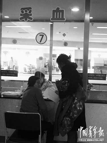 11月21日下午,一名患者在和平醫院新門診大樓的化驗中心采血化驗。11月14日,和平醫院停止了健康體檢中心化驗科的工作,并封存了相關檢測設備。前往該院體檢的人員須到新門診大樓的化驗中心去采血化驗。本報記者來揚攝