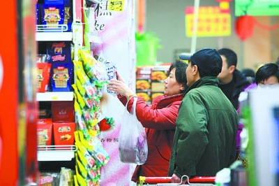 各種年貨禮盒開始競相打折。一款大禮盒中包括了開心果、榛子等6種小零食,1.138千克的規格,原價是168元,降到了90多元;瑞士奶糖買一盒減8元……有市民攜家帶口一起打年貨,購物車內塞得滿滿的。