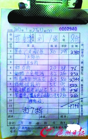 等吃完結賬,一看賬單周先生大吃一驚,1.3萬多元!周先生說,他們不能接受這價格,但考慮到人生地不熟,在和老板商量后,還是刷卡付了1萬元。
