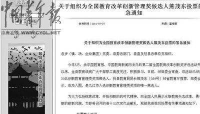 2011年7月27日,江西省永修縣縣委宣傳部發(fā)出紅頭文件《關(guān)于組織為全國(guó)教育改革創(chuàng)新管理獎(jiǎng)候選人熊茂東投票的緊急通知》,提出上述要求。中國(guó)青年報(bào)記者就此采訪永修縣委宣傳部后,這份紅頭文件在永修縣政府網(wǎng)上消失了。