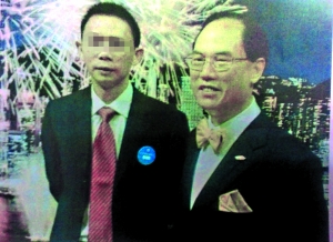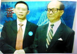 犯罪嫌疑人與“李嘉誠”(實為蠟像)的合影。圖片為記者翻拍