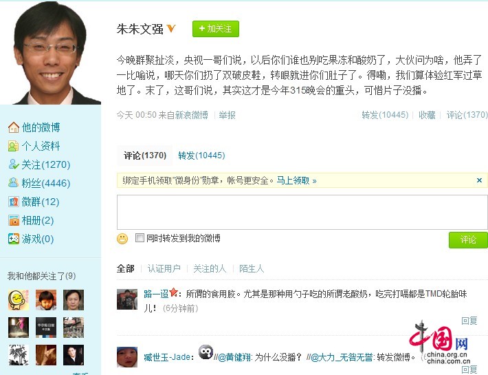 這位經濟觀察報調查新聞部記者朱文強的微博原文為“今晚群聚扯淡,央視一哥們說,以后你們誰也別吃果凍和酸奶了,大伙問為啥,他弄了一比喻說,哪天你們扔了雙破皮鞋,轉眼就進你們肚子了。得嘞,我們算體驗紅軍過草地了。末了,這哥們說,其實這才是今年315晚會的重頭,可惜片子沒播!
