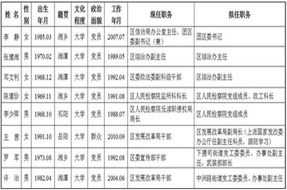 資料圖片:根據湖南省湘潭市岳塘區(qū)4月18日發(fā)布的干部任前公示,一位名為“王茜”的20歲女生將被提拔為該區(qū)發(fā)展改革局副局長,并將“上派到國家發(fā)改委辦公廳任副主任科員,跟班學習”。據公示資料,該女生18歲即參加工作,文化程度為大學,按資料推算應系14歲或者15歲上大學。此外,該女的政治面貌系“群眾”而非“黨員”。、