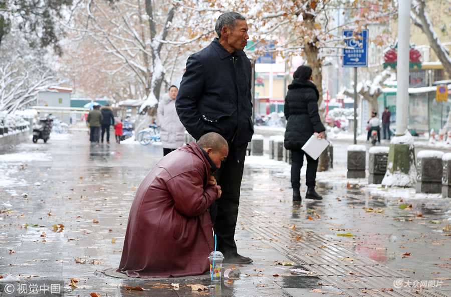 洛陽:兩位民工大雪中輪流蹲熱力井蓋蹭暖 (/)