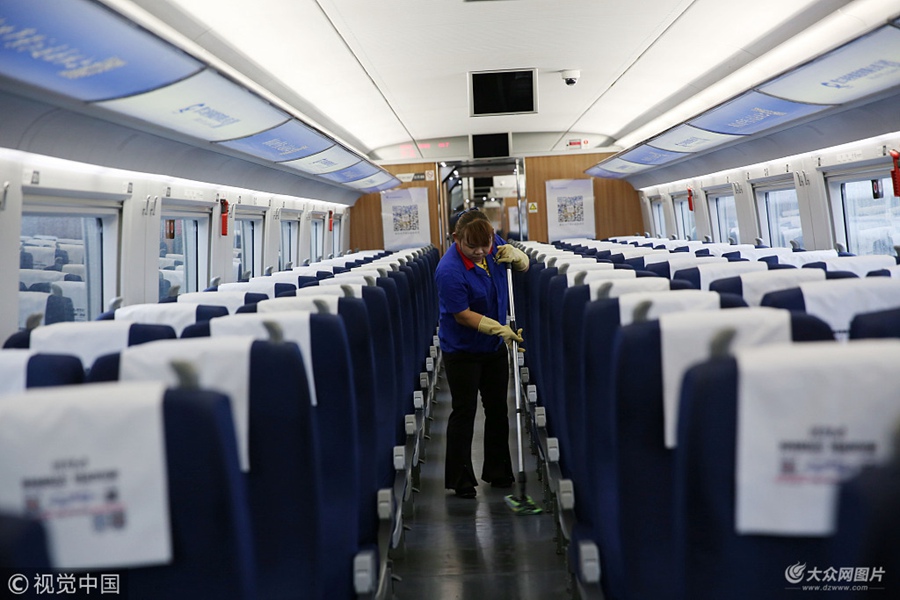 2018年5月6日,西安動車庫,30歲的趙愛銀每天深夜開始在入庫的高鐵動車組車廂里打掃衛生,到第二天上午9點多下班。