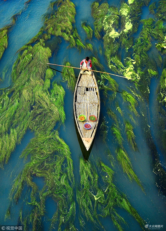 當地時間2018年5月23日,孟加拉博格拉縣戈羅多亞河,27歲的攝影師Abdul Momin站在橋上拍景。船上的人都是當地居民,經常通過這條河前往村里的集市和其他地方。