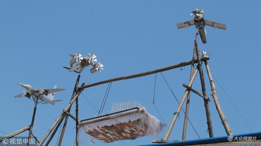 2018年6月24日,山東省日照市一家農(nóng)家樂海鮮店,店主人在平房頂上,安裝了3架“山寨”F35戰(zhàn)斗機(jī),在微風(fēng)中,三架山寨戰(zhàn)斗機(jī)的“螺旋槳”呼呼作響,而且機(jī)身還能左右搖擺,吸引了不少過往居民駐足觀看。