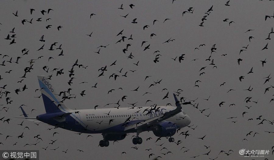 印度飛機降落遇上鴿群起飛被層層包圍 場面壯觀