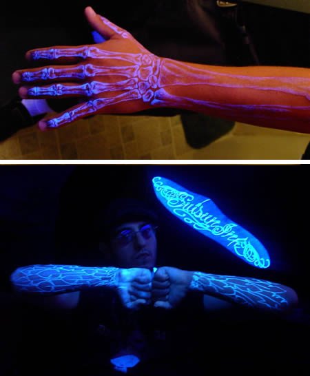 熒光紋身只能在黑暗中看見,有時只有一部分是熒光的。