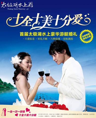 浪漫的婚禮不少,有乘著熱氣球飄蕩在藍天中的空中婚禮,也有穿著潛水服潛入海底世界的水下婚禮,更有騎著駱駝走進漫天黃沙的沙漠婚禮。但你見過乘坐千萬豪華游艇舉行的集體水上婚禮嗎?在2010年10月10日這個三“10”相連的吉日,太極湖“十全十美十分愛”活動將為十對新人打造豪華游艇水上婚禮,十對新人也正好迎合了三“10”這個吉日。他們將乘全球頂級豪華游艇法拉蒂,暢游碧波萬頃的太極湖。太極湖將為相愛的戀人作證,為他們刻畫動人的愛情故事。