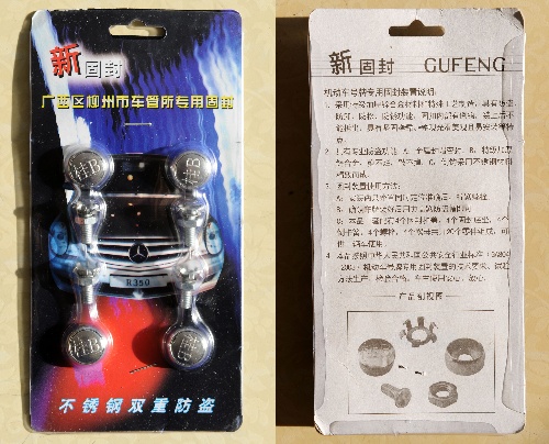 13日,記者來到桂柳機(jī)動(dòng)車技術(shù)檢測(cè)站的服務(wù)大廳,在銷售固封裝置的柜臺(tái)上,有一個(gè)藍(lán)色標(biāo)牌收費(fèi)公示:“固封裝置:27元/套”,記者買了一套,發(fā)現(xiàn)不過是幾個(gè)螺釘螺帽,上面寫著“廣西區(qū)柳州市車管所專用固封”,卻沒有關(guān)于生產(chǎn)廠家的任何信息,也沒有檢驗(yàn)合格標(biāo)志。