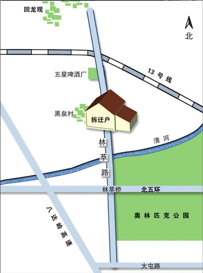 圍觀者口中的老徐叫徐景明,黑泉村32號的主人。此前黑泉村32號在網上有個稱號:北京“最牛釘子戶”,這緣于林萃路工程。5年前,北京市規劃委發布消息,“連接五環路與回龍觀北街的林萃路將開工,通車后,八達嶺高速路擁堵的現象將有所緩解。”但林萃路并未在2008年如期完工,其中在黑泉路一段,始終無法完成規劃中的貫通,即使后期工程施工方臨時做出一些更改,但行駛至此的雙方向車輛,只能沿著一條車道,從房子旁邊繞行,堵車是經常的事情。2009年,海淀區政府回復居民稱,路中一拆遷戶遲遲不肯搬遷,索要580萬元補償,遠超180萬元的補償標準。
