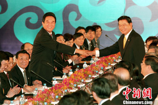 12月21日上午,海協會會長陳云林與;鶗麻L江丙坤的兩會領導人第六次會談在臺北圓山飯店登場。圖為陳江二人在會談開始時相互握手致意。 中新社記者 黃少華 攝