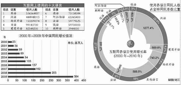 數據顯示,21世紀前10年中,互聯網上使用漢語的人數增長了1277.4%。去年,中國新增互聯網用戶3600萬人,這意味著其總用戶超過4.4億人,大約占總人口的32.6%。