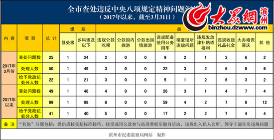統(tǒng)計數(shù)據(jù)顯示,2017年1至3月份,濱州共查處違反中央八項規(guī)定精神問題49起,違規(guī)公務(wù)用車問題達(dá)到了26起,鄉(xiāng)科級以下級別違規(guī)問題48起;99人因違反中央八項規(guī)定被處理,黨政紀(jì)處分41人。