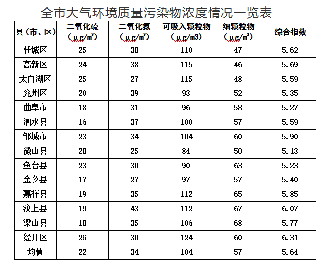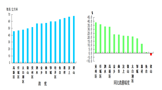 二氧化氮濃度最好的縣(市、區)是微山縣,為25微克/立方米;最差的縣(市、區)是汶上縣,均為43微克/立方米;同比改善幅度最大的縣(市、區)是曲阜市,為27.9%,同比惡化幅度最大的縣(市、區)是泗水縣,為5.7%。