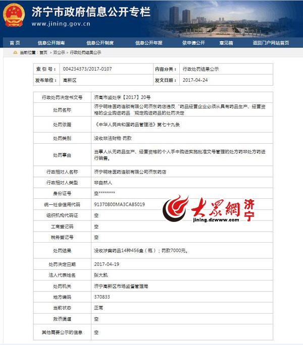 大眾網(wǎng)濟(jì)寧5月8日訊 近日,記者從濟(jì)寧市行政許可和行政處罰信用信息“雙公示”平臺(tái)獲悉,濟(jì)寧明珠醫(yī)藥連鎖有限公司濟(jì)東藥店因違規(guī)購(gòu)進(jìn)藥品,被沒(méi)收涉案藥品并罰款7000元。