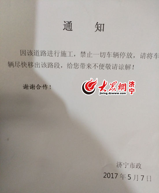 大眾網濟寧5月9日訊(記者 楊樹林)5月8日,市民孫先生撥打濟寧大眾網新聞熱線(0537-2372789)反映,自己的車停在車位里,卻被貼了通知說此路段修路要求挪車,孫先生表示不知道真假。