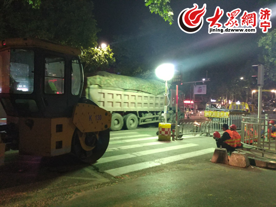 記者在現(xiàn)場注意到,雖然時間已是深夜,但在施工現(xiàn)場完全是一幅熱火朝天的景象,有人員在路障旁指揮交通,有人員在操縱機器修補路面,旁邊還不停有渣土車進出運送垃圾。