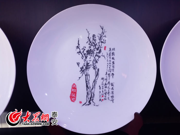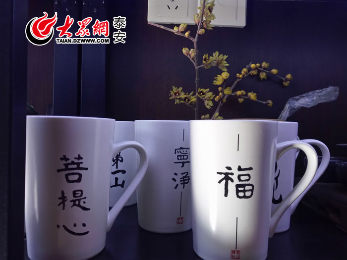 我是杯子控,看到各種圖案和樣式的杯子就喜歡買買買!疤┥蕉Y物”里的馬克杯外形都是白瓷凈面,配不同《金剛經》石刻字,還是很超脫。著名的石刻經石峪《金剛經》,被譽為“大字鼻祖”、“榜書之宗”,兩千多平方米的大石坪僅殘存1000余字。其字個個端莊肅穆、樸拙渾厚,“不以小巧示人”,又同泰岱神韻高度融合,在馬克杯上,顯得與眾不同。還有光潔的白盤,盤上圖案由純手工打磨,刻紋清晰,設計制作堪為精品。