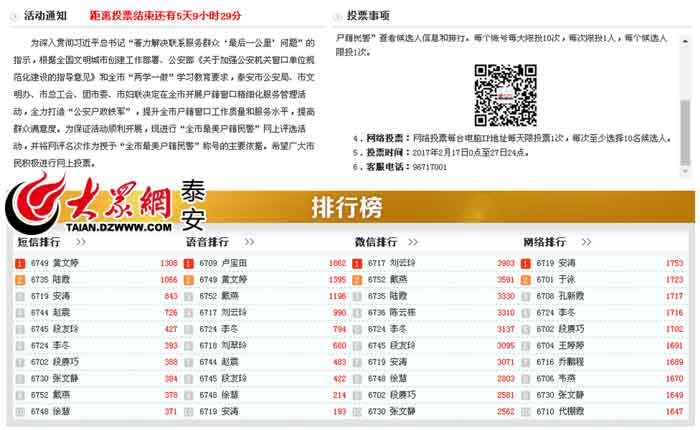 泰安“全市最美戶籍民警”評選由泰安市公安局、市文明辦、市總工會、團(tuán)市委、市婦聯(lián)合舉辦。經(jīng)過層層選拔,最終確定了52名優(yōu)秀戶籍民警作為此次推選活動的候選人,并由大眾網(wǎng)泰安頻道承辦評選活動的網(wǎng)絡(luò)投票平臺。