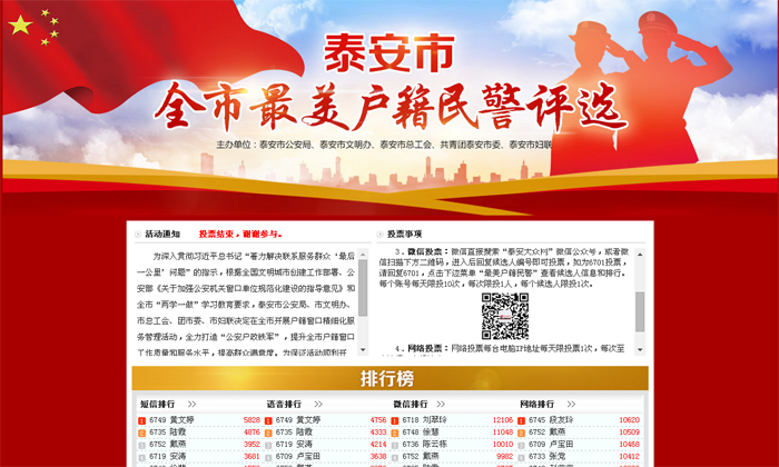 泰安“全市最美戶籍民警”評選。經(jīng)過層層選拔,最終確定了52名優(yōu)秀戶籍民警作為此次推選活動的候選人。此次投票堅持“公開、公平、公正”和“群眾參與、把評判權(quán)交給群眾”的原則。網(wǎng)友可登錄大眾網(wǎng)泰安頻道投票專題頁面或者關(guān)注泰安大眾網(wǎng)官方微信(點擊進入投票網(wǎng)址:(http://tp.dzwww.com/2017/tahjjc/),關(guān)注"全市最美戶籍民警"投票活動。