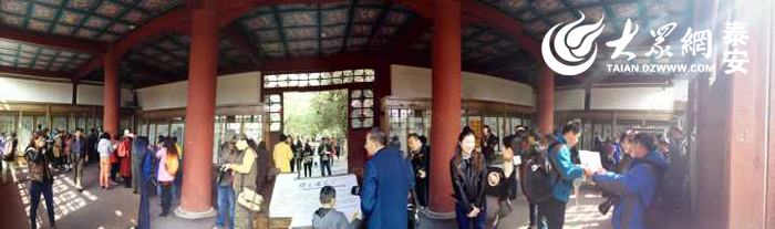 大眾網(wǎng)泰安3月25日訊(記者 趙偉)3月25日,泰安岱廟配天門殿里人頭攢動(dòng),在一幅展出的春日主題國畫前,泰安市民盛女士正為孩子詳細(xì)解釋著工筆畫和寫意畫的區(qū)別。當(dāng)天上午,由大眾網(wǎng)、岱廟主辦的《獨(dú)立煙嵐——首屆網(wǎng)媒中國書畫名家名作邀請(qǐng)展》在這里舉行,大眾網(wǎng)邀請(qǐng)的十三位國內(nèi)書畫名家攜46幅書畫佳作,為泰安市民和游客奉獻(xiàn)上了一道豐盛的文化藝術(shù)大餐。