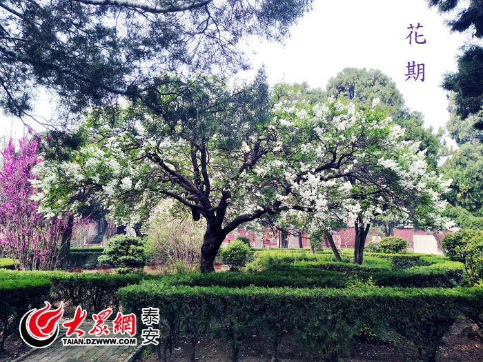 泰山廣場:杏花、爬藤月季;西側(cè)御碑園有連翹、榆葉梅和紫葉李。