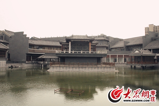 青灰色的磚墻,翹首的飛檐,一灣清河蜿蜒環繞著亭臺榭閣,長長的廊道寂靜悠長,在這些亭臺榭閣中央,矗立著一方三面環水的舞臺,一泊小船?堪哆。這一融合著徽派建筑、蘇州水鄉和北方民居建筑風格的11個水街、32座小橋形成了魯南水城。在規劃中,這片水城不僅是一座旅游地,它還是一個不夜城,燈光遍布大大小小的地方,一個長300米,投資1500萬元的天幕,是水城獨一無二的標志。